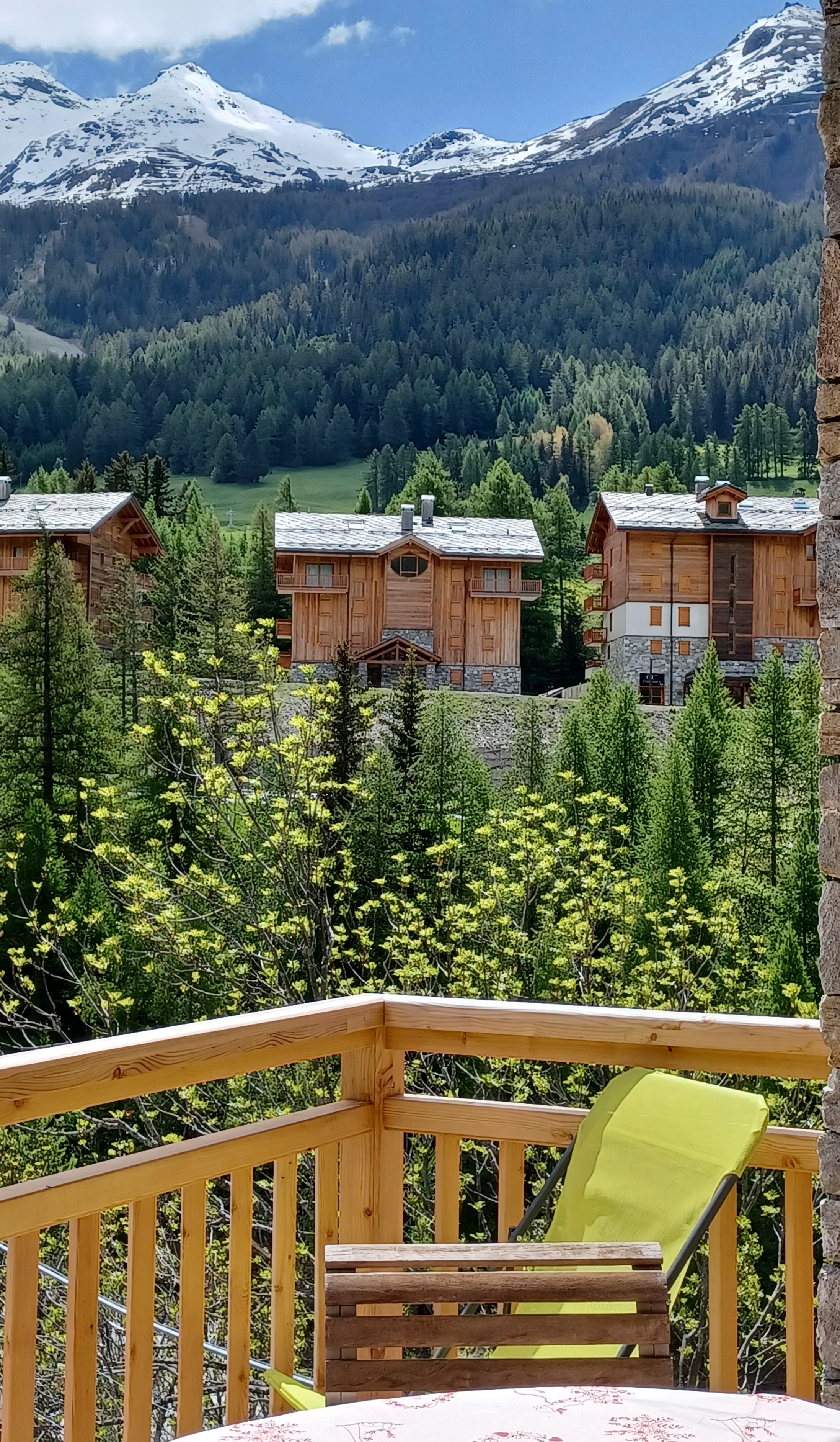 A l’extérieur, la vue montagne vient de la grande baie côté EST donnant sur le balcon qui vous permettra de vous poser ou déjeuner à l’abri.